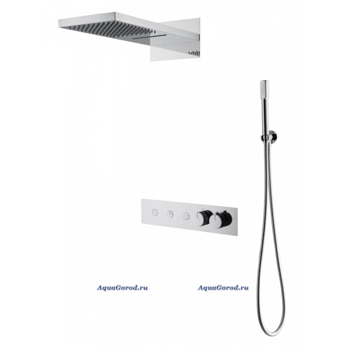 Оснащение: термостатический смеситель с переключателем потоков, душевой шланг, душевая лейка, держатель для душа