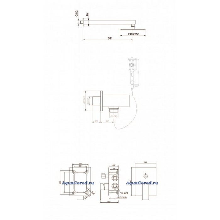 - Комплектация: смеситель со встроенной частью, верхний душ, ручной душ, лейка, настенный держатель