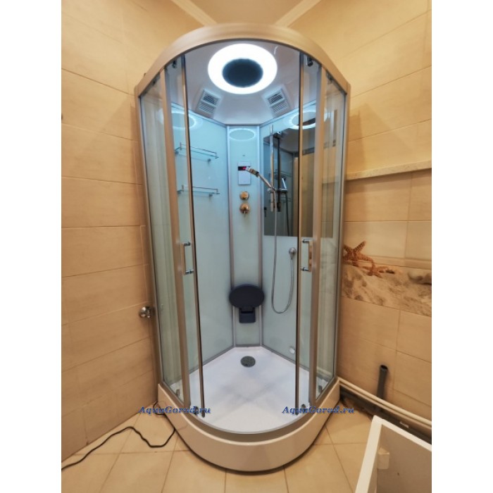 Полностью стеклянная угловая, полукруглая душевая кабина из закалённого (ESG) стекла с низким поддоном и Турецкой баней. Передние стёкла прозрачные, задние стёкла белые; толщина стёкол 6 мм. На центральной стойке размещены сенсорный пульт управления душевой кабиной с дисплеем, 3 направленных форсунки, переключатель режимов, смеситель. С помощью пульта вы можете включать свет, настраивать радиостанции, управлять режимом работы парогенератора. В нижней части задней стенки расположена колба, в которую, при принятии Турецкой бани, вы можете добавлять различные аромамасла. Двери в кабине раздвижные, плавность хода которых гарантирована установленными на них двойными металлическими роликами. Для комфорта принятия турецкой бани на центральной стойке находится откидное сиденье. Для удобства ухода за кабиной в выпуск встроена специальная колба для сбора мусора и волос, которая легко чистится и предотвращает засорение сливных патрубков.