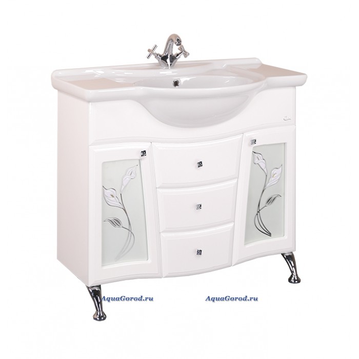 Тумба под умывальник прямоугольной формы с 2 распашными дверками и 3 выдвижными ящиками. Материал корпуса - влагостойкий ДСП, покрытие корпуса - пленка ПВХ. Материал фасада - МДФ, стекло с декоративным рисунком, покрытие фасада - пленка ПВХ. Монтаж - напольный. Комплект поставки включает в себя: тумбу, 2 распашных дверки, 3 выдвижных ящика, 5 ручек, комплект доводчиков, комплект ножек, инструкцию по эксплуатации. Цвет корпуса - белый, цвет фасада - белый. Страна производитель - Россия. Гарантия завода изготовителя - 2 года.
