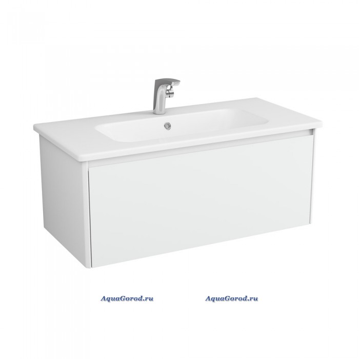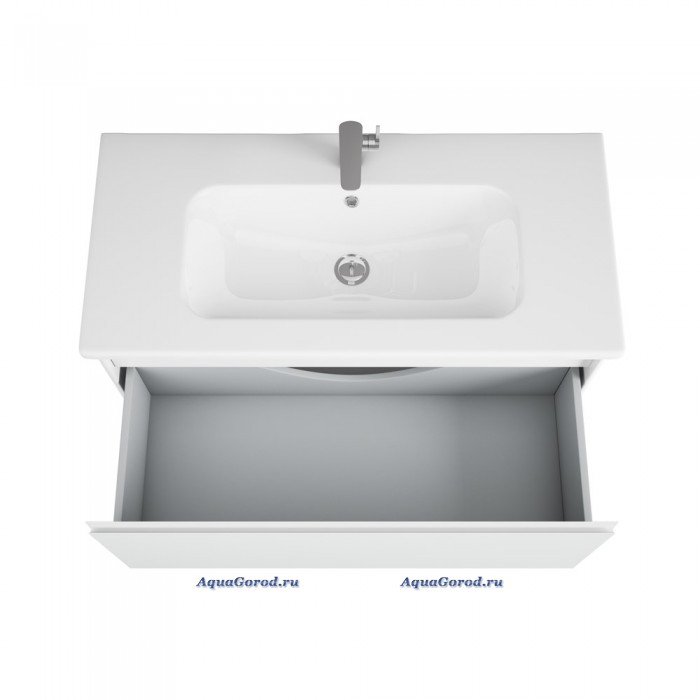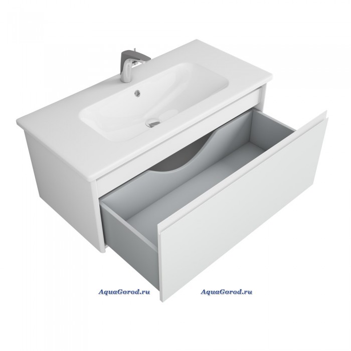 Подвесная тумба под умывальник прямоугольной формы с 1 выдвижным ящиком (Доводчики плавного закрывания, подвесной регулируемый механизм) со специальным анатомически удобным вырезом сверху на фасаде ящика вместо ручки. Фасад сверху отделан специальным стеклом лакобель белого цвета.Внутри верхнего ящика единое пространство, для того чтобы как можно больше вещей могло в него поместиться. Сверху на тумбу установлена полувстраеваемая раковина прямоугольной формы из сантехнического фарфора.