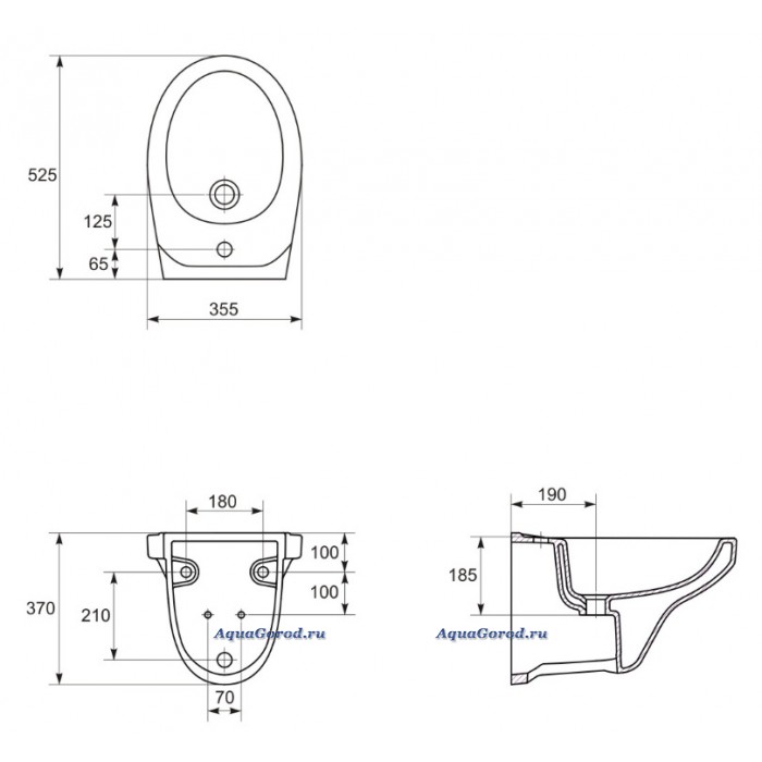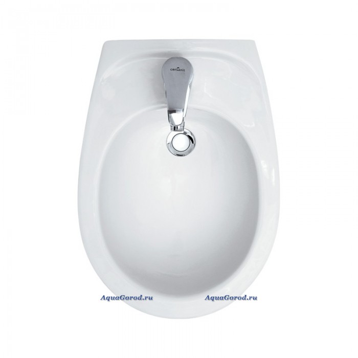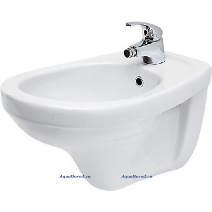 Биде подвесное, овальной формы, белого цвета. Отверстие под смеситель и отверстия под слив и перелив расположены по центру. Направление выпуска - горизонтальное (в стену). Биде со встроенным сливом-переливом.
