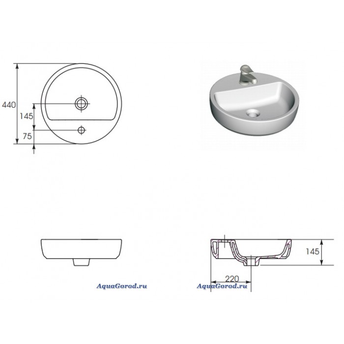 Габаритные размеры раковины ШхГхВ, мм.: 440х440х145