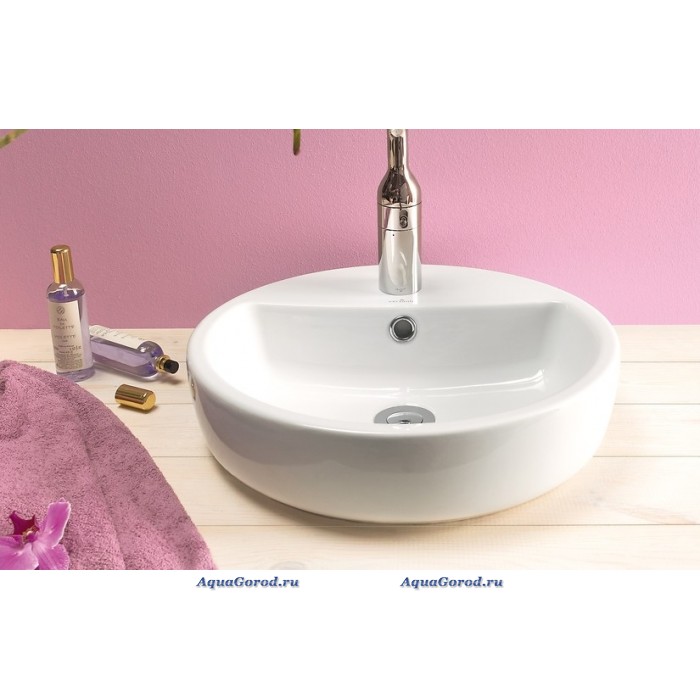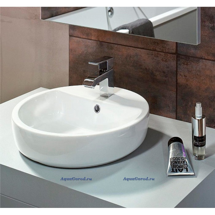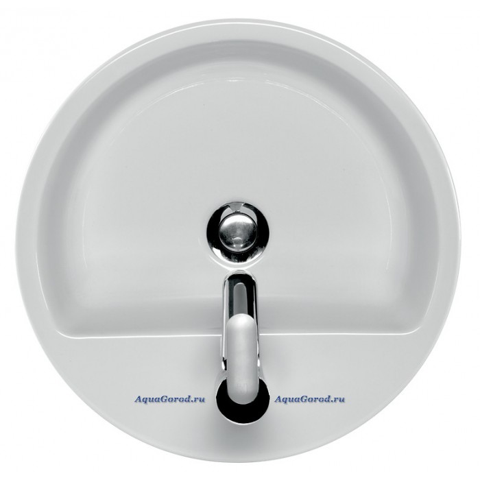 Раковина белого цвета, круглой формы, оснащена отверстием под смеситель и встроенным слив-переливом. Может использоваться в качестве накладной и устанавливаться на столешницу или тумбу.