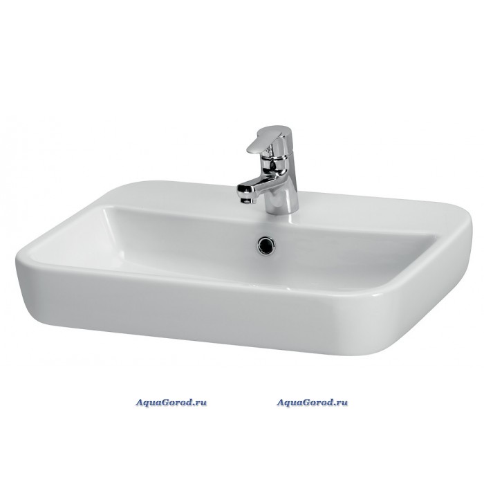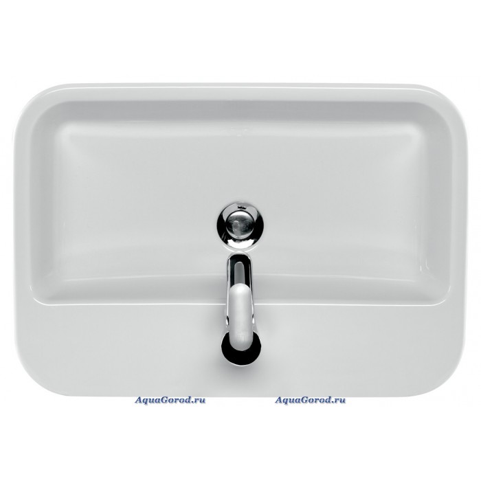 Раковина белого цвета, прямоугольной формы, оснащена отверстием под смеситель и встроенным слив-переливом. Может использоваться в качестве накладной и устанавливаться на столешницу или тумбу.
