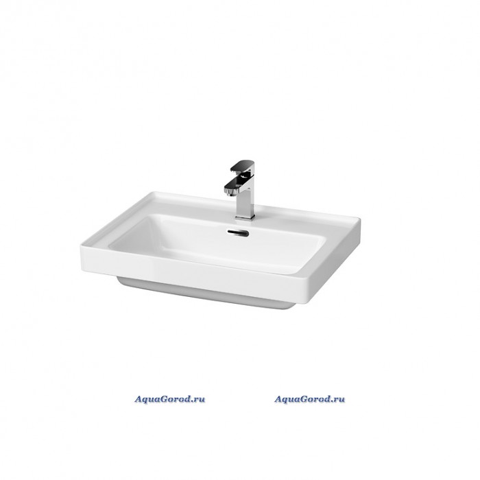 Раковина белого цвета, прямоугольной формы, с отверстием под смеситель и встроенным слив-переливом. Может использоваться в качестве подвесной или полувстраиваемой (устанавливаться на тумбу).