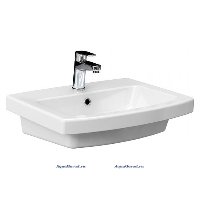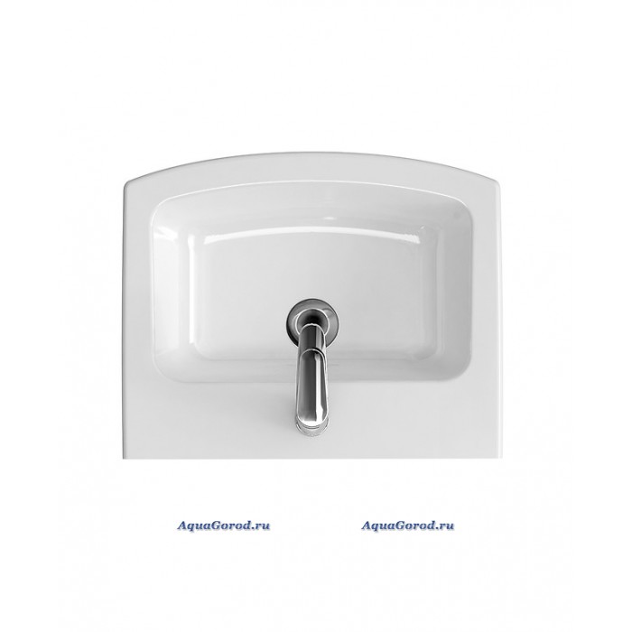 Раковина белого цвета, прямоугольной формы, с отверстием под смеситель и встроенным слив-переливом. Может использоваться в качестве подвесной или полувстраиваемой (устанавливаться на тумбу).