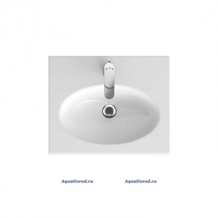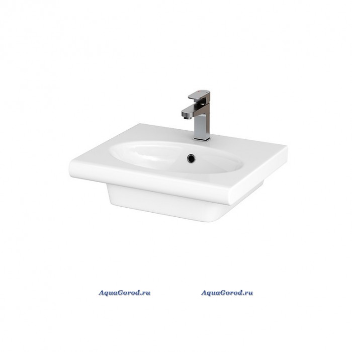 Раковина белого цвета, прямоугольной формы, с отверстием под смеситель и встроенным слив-переливом. Может использоваться в качестве подвесной, устанавливаться на пьедестал, или накладной (устанавливаться на столешницу или тумбу).