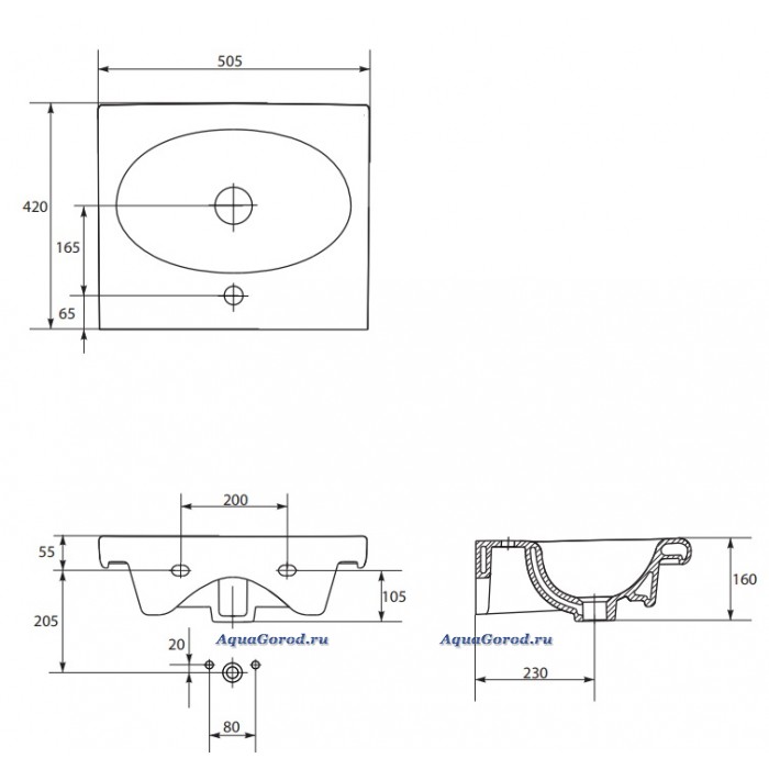 Габаритные размеры раковины ШхГхВ, мм.: 505х420х160