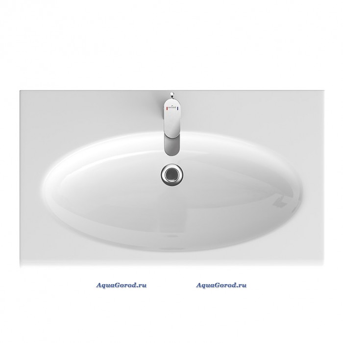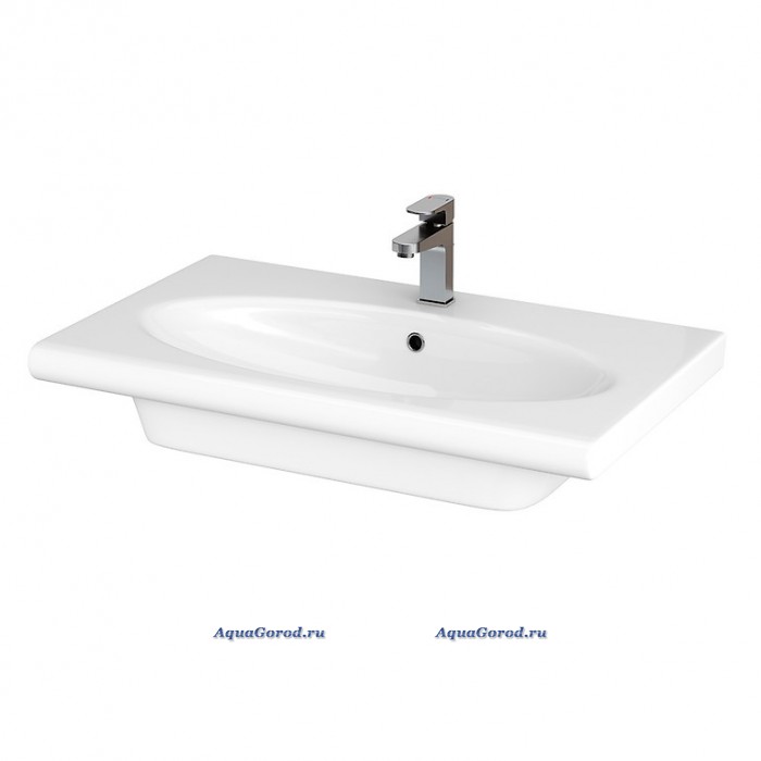 Раковина белого цвета, прямоугольной формы, с отверстием под смеситель и встроенным слив-переливом. Может использоваться в качестве подвесной, устанавливаться на пьедестал, или накладной (устанавливаться на столешницу или тумбу).