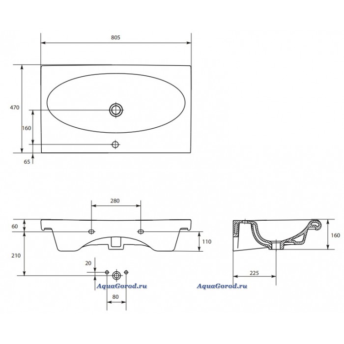 Габаритные размеры раковины ШхГхВ, мм.: 805х470х170