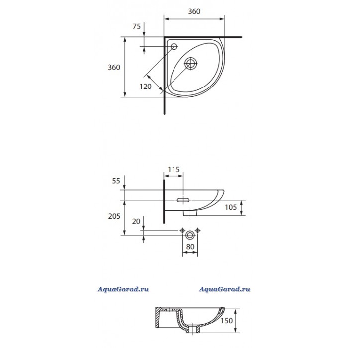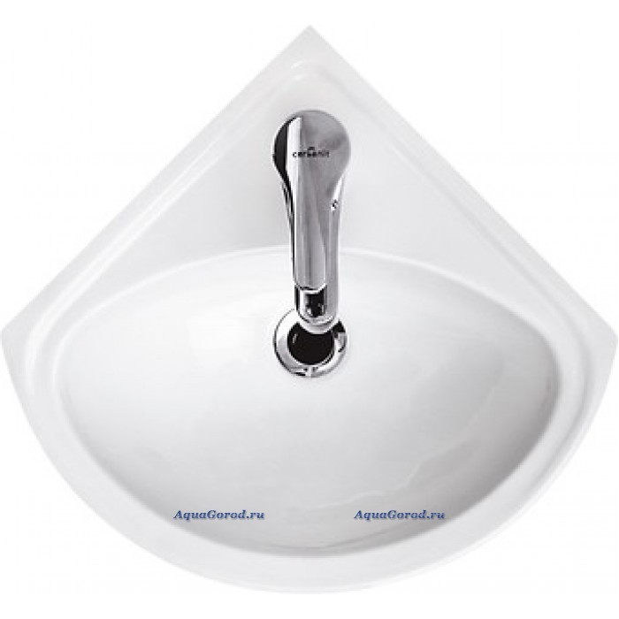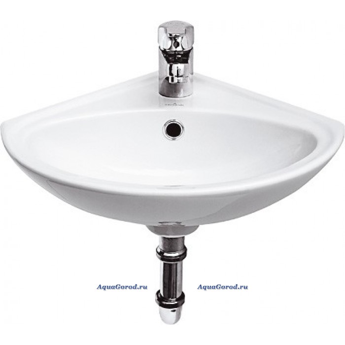 Раковина белого цвета, угловой формы, с отверстием под смеситель и встроенным слив-переливом. Может использоваться в качестве подвесной или полувстраиваемой (устанавливаться на тумбу).