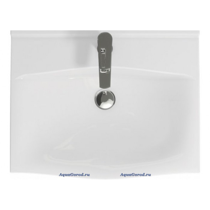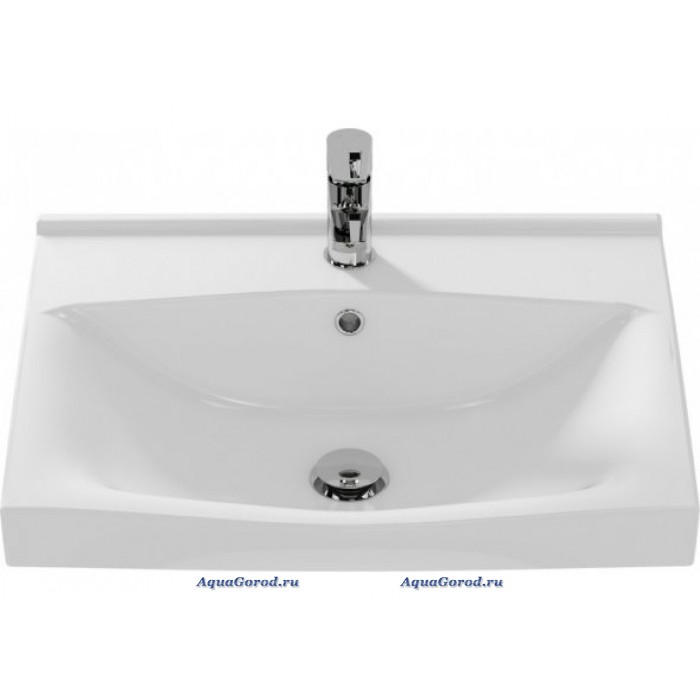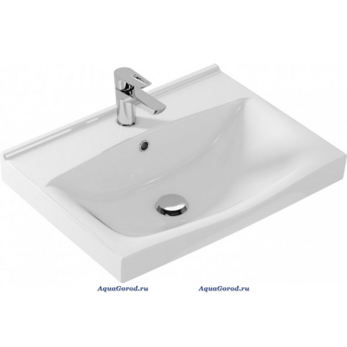 Раковина белого цвета, прямоугольной формы, с отверстием под смеситель и встроенным слив-переливом. Может использоваться в качестве подвесной, устанавливаться на пьедестал или накладной (устанавливаться на столешницу или тумбу).
