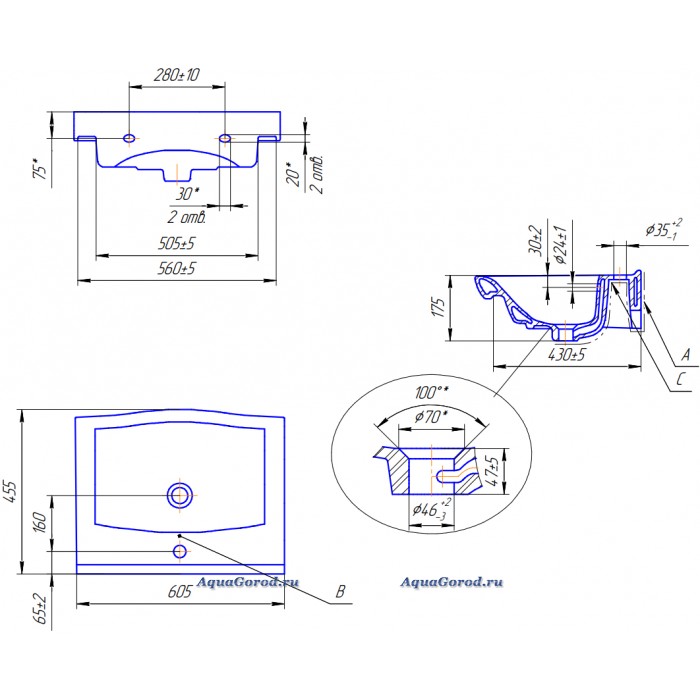 Габаритные размеры раковины ШхГхВ, мм.: 605х455х175
