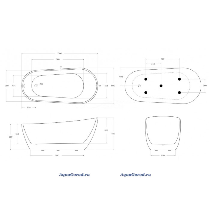 Акриловая ванна BelBagno BB704 170x80 см, отдельностоящая, белая, овальная, на ножках, со сливом-переливом, с донным клапаном