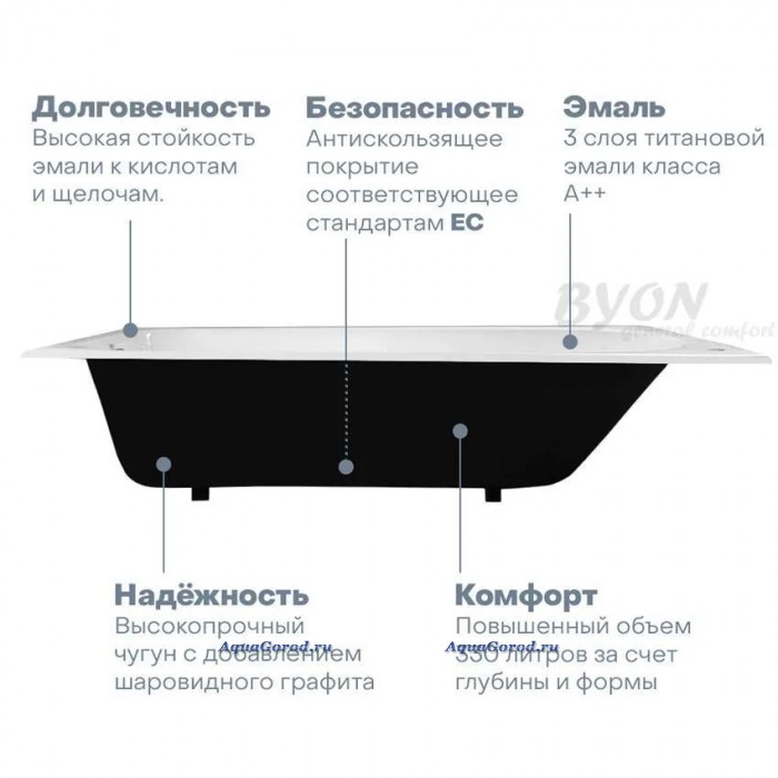 Ванны Byon выполнены в классическом стиле из чугуна высокого качества. Покрытие эмалью с содержанием титана в несколько слоев дает идеально ровное и гладкое покрытие, с небольшим антискользящим эффектом. Глубина чугунных ванн Byon различна и начинается от 39 см, поэтому любой желающий сможет подобрать подходящую для себя модель. Гарантия производителя на ванны из чугуна Byon 3 года, а срок службы указан 25 лет.