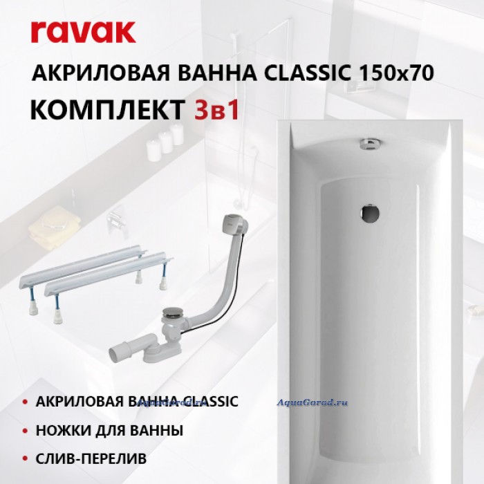 Сет: акриловая ванна Ravak Classic 150 х 70 с ножками и слив-переливом