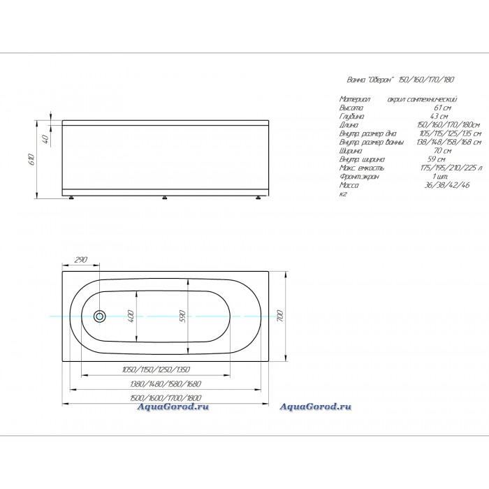 Ванна акриловая Aquatek Оберон 150x70 см прямоугольная универсальная