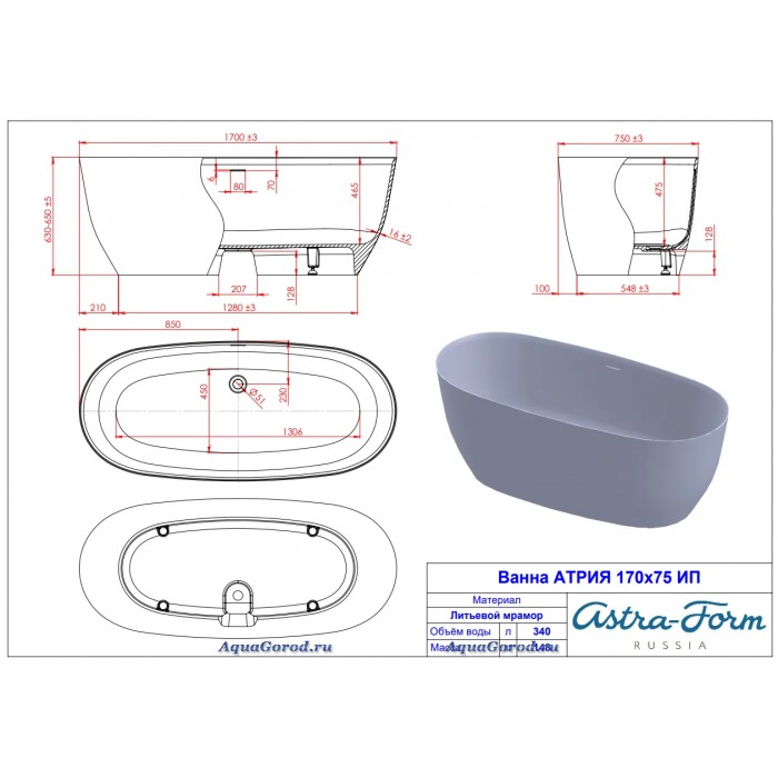 Ванна Astra-form Атрия Solid surface 1700х750 с интегрированным переливом белая матовая
